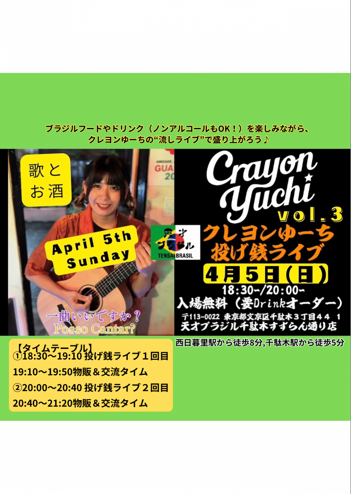 投げ銭ライブ第3回、開催決定!場所:天才ブラジル2号店 千駄木すずらん通り店