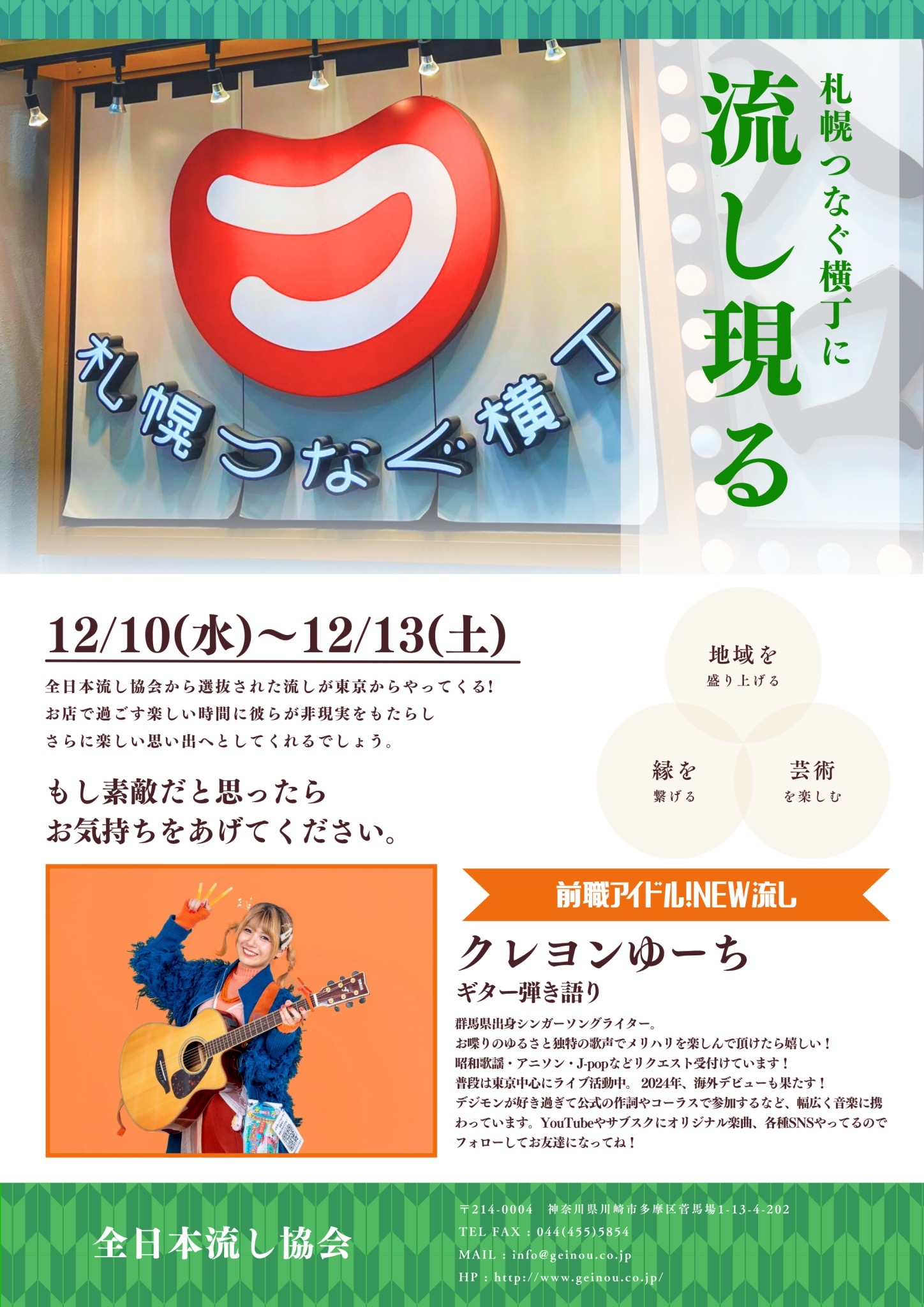 12/10~13(4日間)/札幌つなぐ横丁で流し時間:毎晩19-23時ごろ
